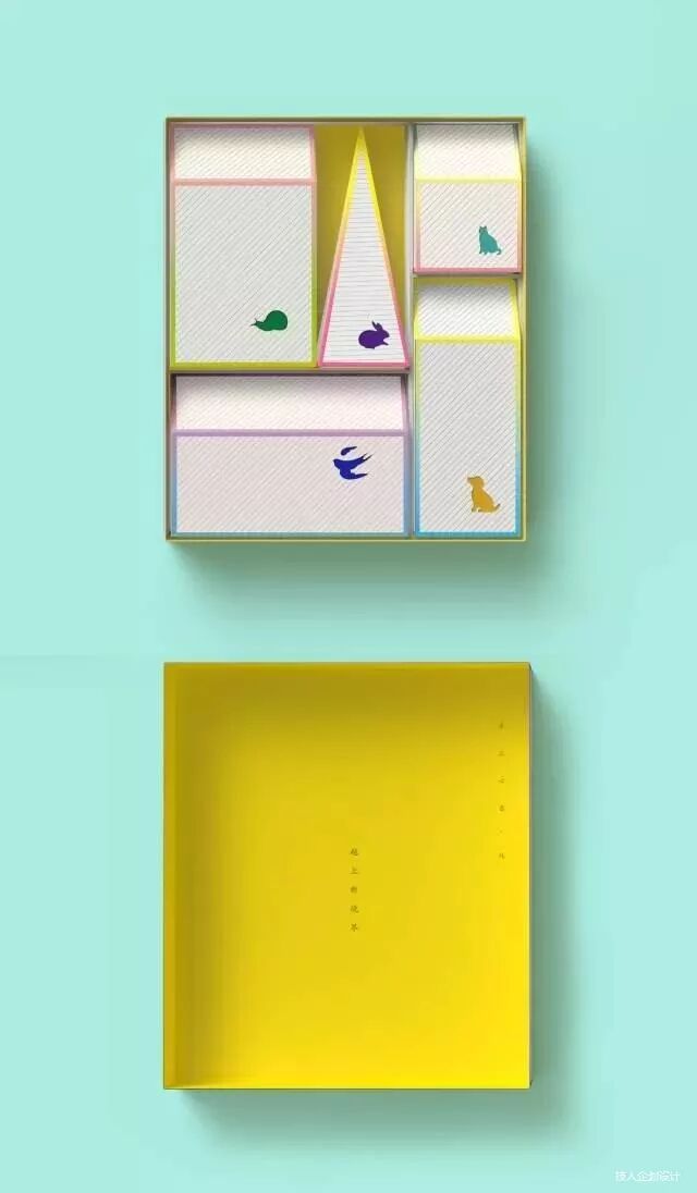 打开包装盒时,三个包装连成一幅有着瑞鹤、高山、明月的抽象山水画。